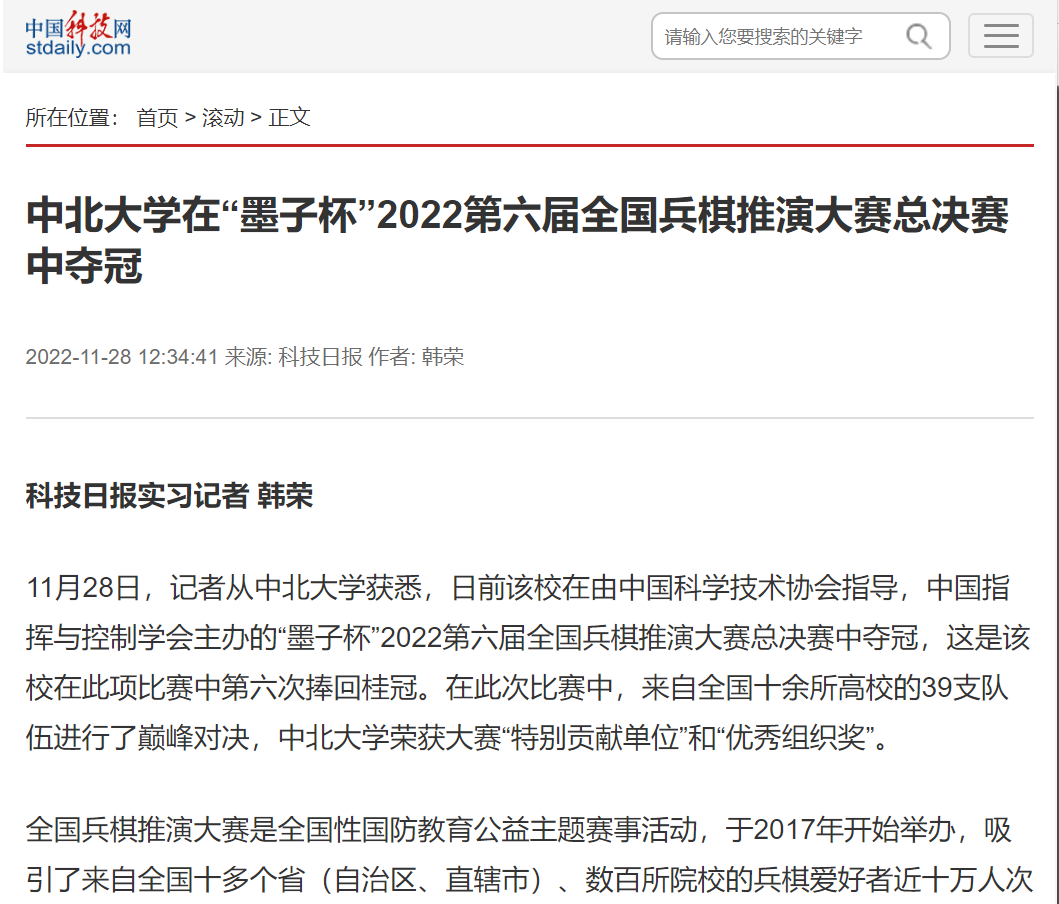 11月28日,记者从中北大学获悉,日前该校在由中国科学技术协会指导,中国指挥与控制学会主办的“墨子杯”2022第六届全国兵棋推演大赛总决赛中夺冠,这是该校在此项比赛中第六次捧回桂冠。在此次比赛中,来自全国十余所高校的39支队伍进行了巅峰对决,中北大学荣获大赛“特别贡献单位”和“优秀组织奖”。