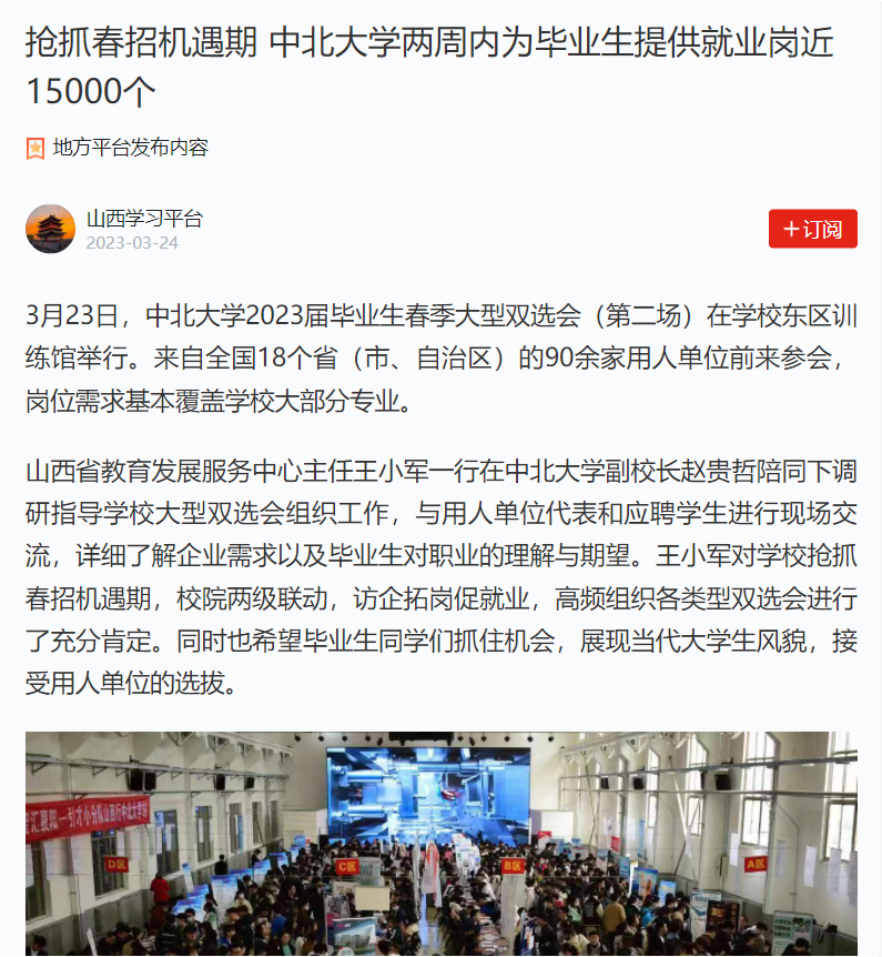 本学期开学以来,在学校领导的亲自部署和相关部门的大力配合下,招生与就业工作部以“等不起”的紧迫感、“慢不得”的危机感、“坐不住”的责任感,认真贯彻教育部相关精神,抢抓春招机遇期、开展春季促就业攻坚行动,高频次开展线下专场招聘,挖潜创新开拓更多市场化岗位,做实做细就业指导服务,全力促进高校毕业生顺利就业、尽早就业。仅过去两周,学校共举办中大型招聘会9场,接待近400家各类用人单位到校选拔人才,其中大型综合双选会2场,兵器工业、兵器装备专场行业招聘会2场,山西太原、江苏南通、江苏南京、湖北襄阳等地方组团招聘活动4场,机械、能动学院主场招聘会1场;举办专场宣讲会77场,其中涵盖中国兵器、中国航天、中国航空、中国航发、中国建筑、中核工业、中交建筑、中国中铁等央企集团下属企业,以及比亚迪、吉利汽车、深南电路、华润微电子、日照钢铁等各行业领军企业,为毕业生提供用人需求近15000个。