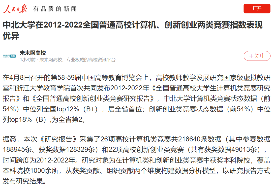 在4月8日召开的第58·59届中国高等教育博览会上,高校教师教学发展研究国家级虚拟教研室和浙江大学教育学院首次共同发布2012-2022年《全国普通高校大学生计算机类竞赛研究报告》和《全国普通高校创新创业类竞赛研究报告》,中北大学计算机类竞赛状态数据(前54%)中位列全国top12%(B+),居全省首位;创新创业类竞赛状态数据(前54%)中位列top18%(B),为全省第2。