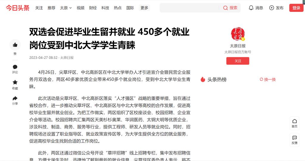 此次活动是尖草坪区、中北高新区落实“人才强区”战略的重要举措,旨在通过省校合作,进一步推动尖草坪区、中北高新区与中北大学等高校的合作发展,促进高校毕业生留并就业创业。为把工作做实,两区组织了区校座谈会、校园招聘、企业宣介会等活动。校园招聘共汇集两区天美杉杉奥莱、华润医药、太钢大明等优质企业,涉及科技、制造、商务、服务等行业,提供工程师、研发人员等就业岗位。同时,招聘现场还设置了职业指导区、就业政策宣传区等,为大学生提供全方位的就业服务,促进高校毕业生找到合适的工作岗位。