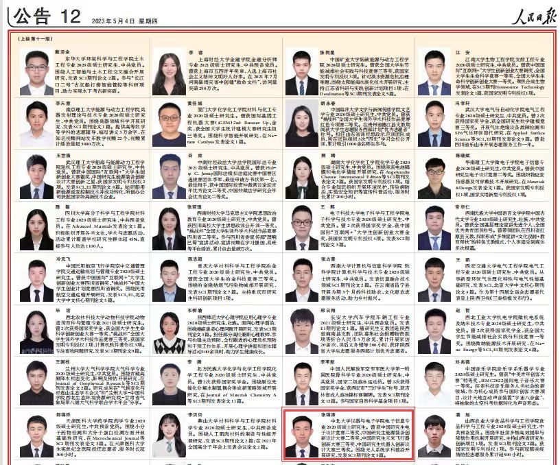 5月4日,《人民日报》刊登了2021-2022学年度研究生国家奖学金获奖学生代表名录,从全国4.5万名研究生国家奖学金获得者中评选出的100名优秀典型代表。全省3名学生上榜。中北大学2020级硕士研究生、国家奖学金获奖学生代表、仪器与电子学院张锦涛荣登名录。硕士期间,张锦涛围绕无人系统学科前沿开展研究,以第一作者、第二作者/导师一作身份在IEEE TITS、IEEE TIE、IEEE TIM等国际顶级杂志发表SCI论文5篇,担任IEEE TVT、IEEE TIV等多个SCI期刊审稿人。获中国研究生电子设计竞赛最佳论文奖(全省唯一)、MathWorks企业专项二等奖(全省唯一)等多个国家级A类赛事奖项。现已拟录取至清华大学攻读博士研究生。
