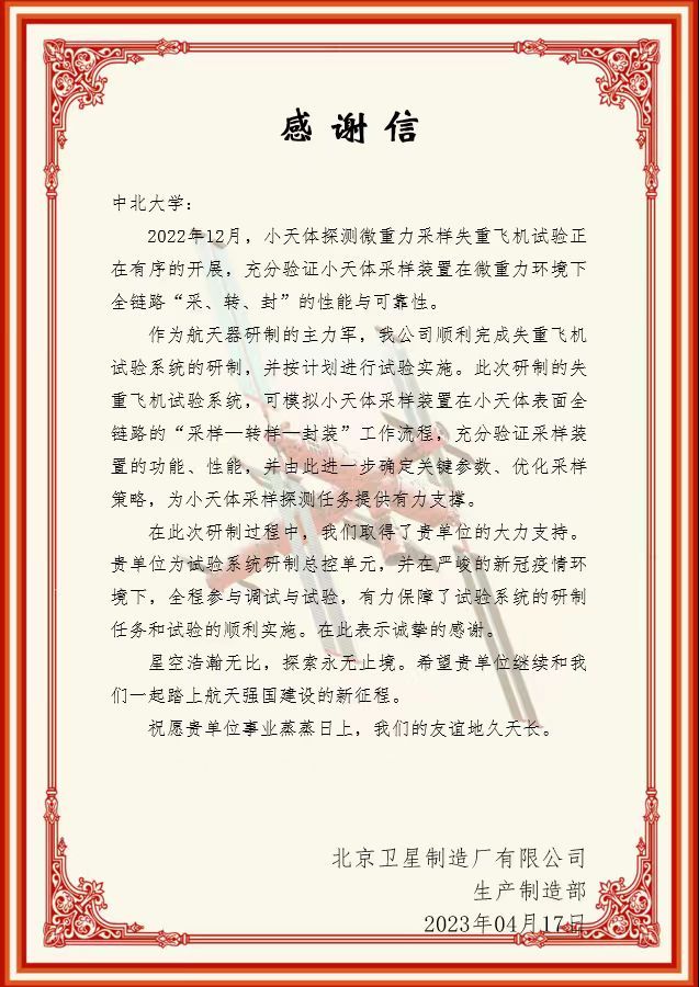 助力航天工程,中北大学仪器与电子学院收到北京卫星制造厂发来的感谢信。该学院李永红教授团队承担了北京卫星制造厂“小天体探测重力采样失重飞机试验系统总控单元”的研制工作,并在严峻的新冠疫情条件下全程参与调试与实验,保证了实验系统的研制任务和实验的顺利实施,为小天体采样探测任务提供了有力支撑。