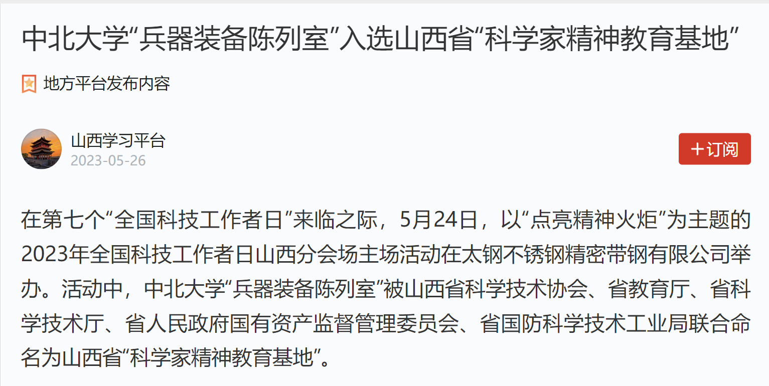 在第七个“全国科技工作者日”来临之际,5月24日,以“点亮精神火炬”为主题的2023年全国科技工作者日山西分会场主场活动在太钢不锈钢精密带钢有限公司举办。活动中,中北大学“兵器装备陈列室”被山西省科学技术协会、省教育厅、省科学技术厅、省人民政府国有资产监督管理委员会、省国防科学技术工业局联合命名为山西省“科学家精神教育基地”。