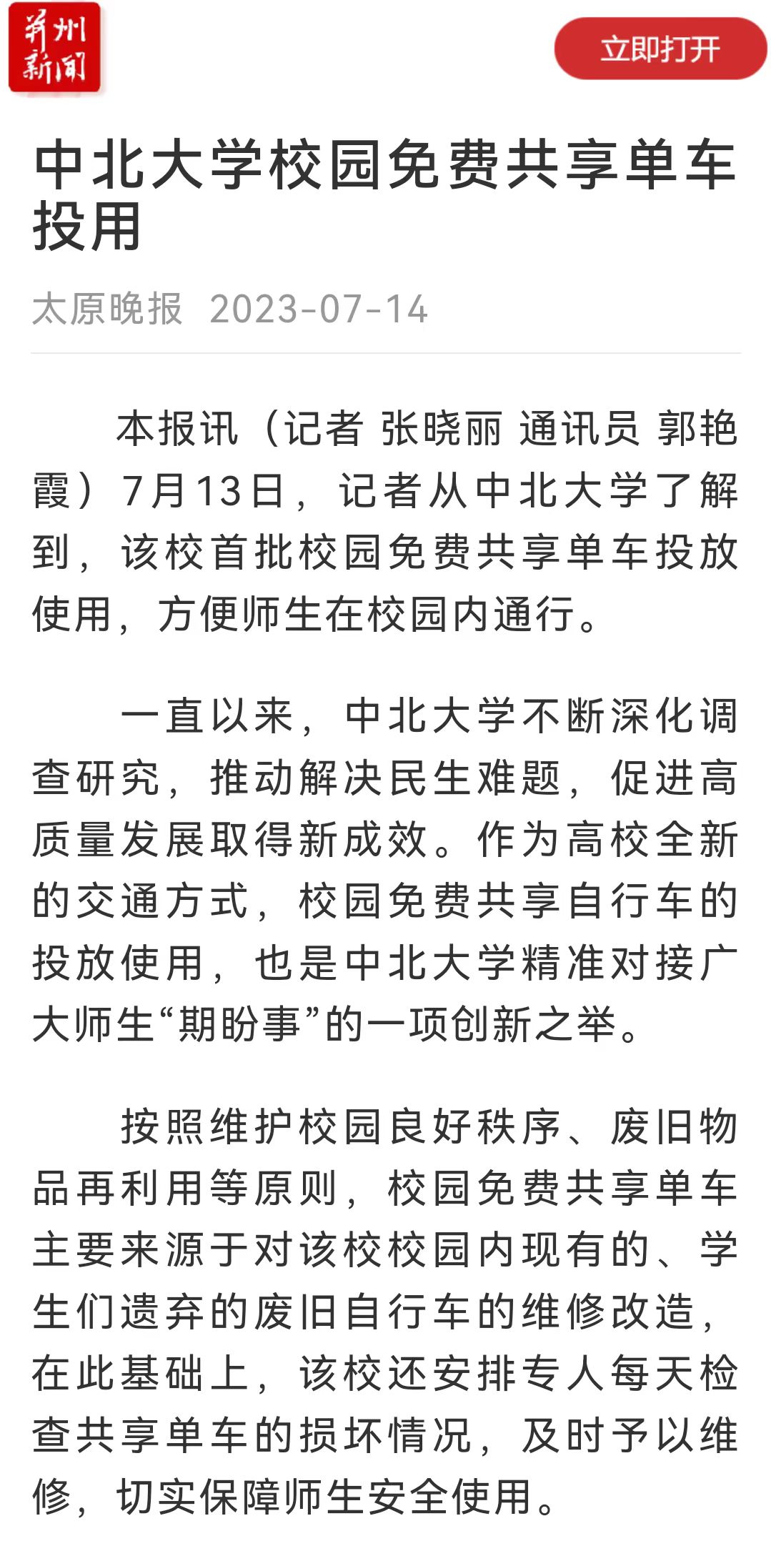 本报讯(记者 张晓丽 通讯员 郭艳霞)7月13日,记者从中北大学了解到,该校首批校园免费共享单车投放使用,方便师生在校园内通行。
