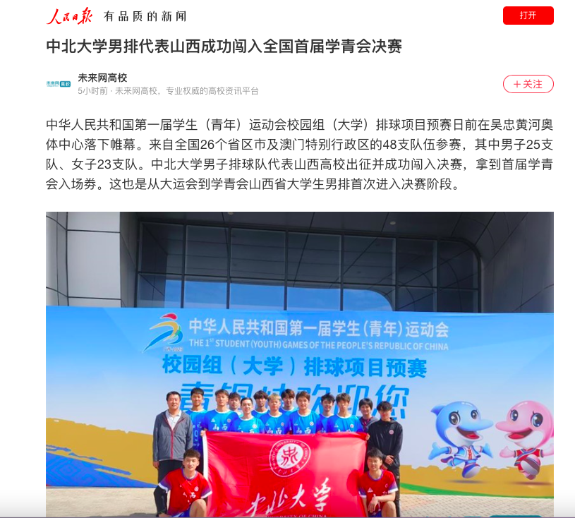中华人民共和国第一届学生(青年)运动会校园组(大学)排球项目预赛日前在吴忠黄河奥体中心落下帷幕。来自全国26个省区市及澳门特别行政区的48支队伍参赛,其中男子25支队、女子23支队。中北大学男子排球队代表山西高校出征并成功闯入决赛,拿到首届学青会入场劵。这也是从大运会到学青会山西省大学生男排首次进入决赛阶段。