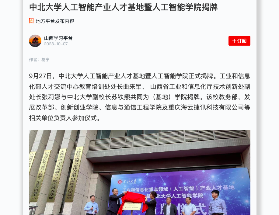 9月27日,中北大学人工智能产业人才基地暨人工智能学院正式揭牌。工业和信息化部人才交流中心教育培训处处长曲来军、 山西省工业和信息化厅技术创新处副处长张莉娜与中北大学副校长苏铁熊共同为(基地)学院揭牌。该校教务部、发展改革部、创新创业学院、信息与通信工程学院及重庆海云捷讯科技有限公司等相关单位负责人参加仪式。
