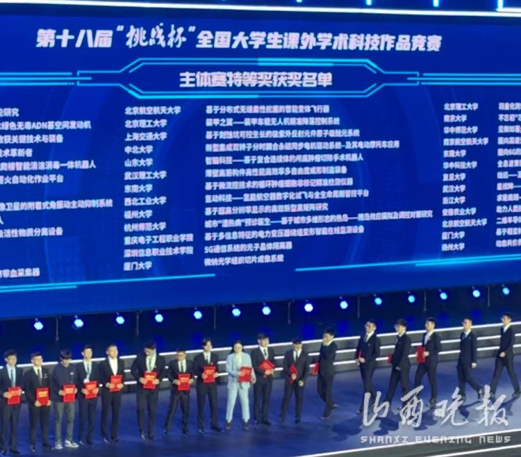 10月30日,第十八届“挑战杯”全国大学生课外学术科技作品竞赛终审决赛在贵州大学落下帷幕。在主体赛中,中北大学斩获特等奖1项,二等奖1项,三等奖3项。其中《新型集成双转子分时耦合永磁同步电机驱动系统——及其电动摩托车应用》项目荣获特等奖,这是该校历史上首次获此殊荣;《“悬鹰”——智能化主动空气悬架》项目荣获二等奖;《水凝胶——可穿戴柔性传感器先行者》《精神传承与符号嬗变——晋域文物文化的保护开发和宣发设计新路径研究》《仿生螃蟹探测机器人》项目荣获三等奖。在“黑科技”专项赛中,荣获“星系级”(特等奖)作品1件,“行星级”(二等奖)作品3件,“卫星级”(三等奖)作品3件。同时,中北大学首次在“挑战杯”大赛中捧得“优胜杯”。