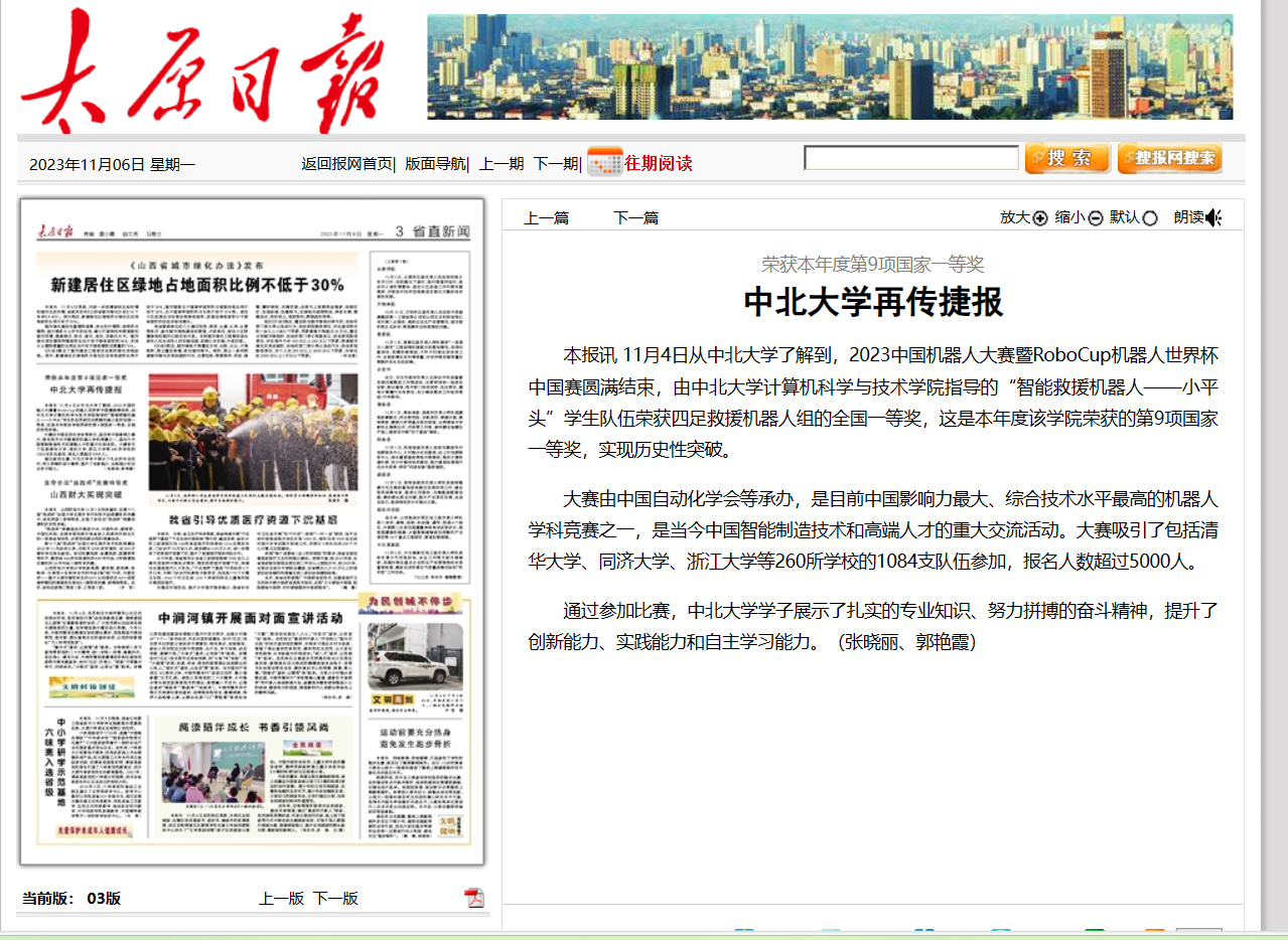 11月4日从中北大学了解到,2023中国机器人大赛暨RoboCup机器人世界杯中国赛圆满结束,由中北大学计算机科学与技术学院指导的“智能救援机器人——小平头”学生队伍荣获四足救援机器人组的全国一等奖,这是本年度该学院荣获的第9项国家一等奖,实现历史性突破。