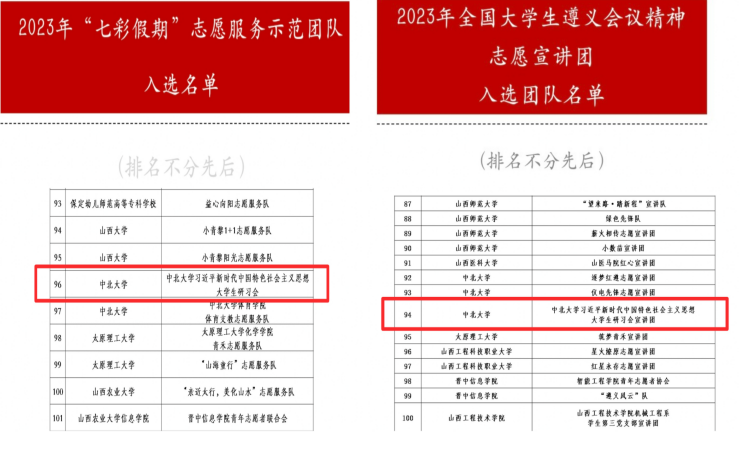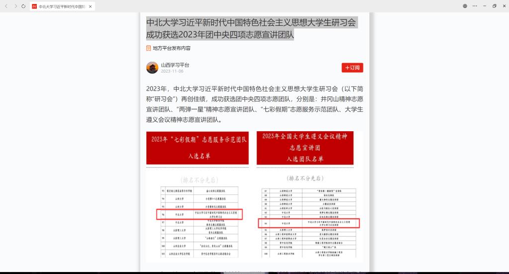 2023年,中北大学习近平新时代中国特色社会主义思想大学生研习会(以下简称“研习会”)再创佳绩,成功获选团中央四项志愿团队,分别是:井冈山精神志愿宣讲团队、“两弹一星”精神志愿宣讲团队、“七彩假期”志愿服务示范团队、大学生遵义会议精神志愿宣讲团队。