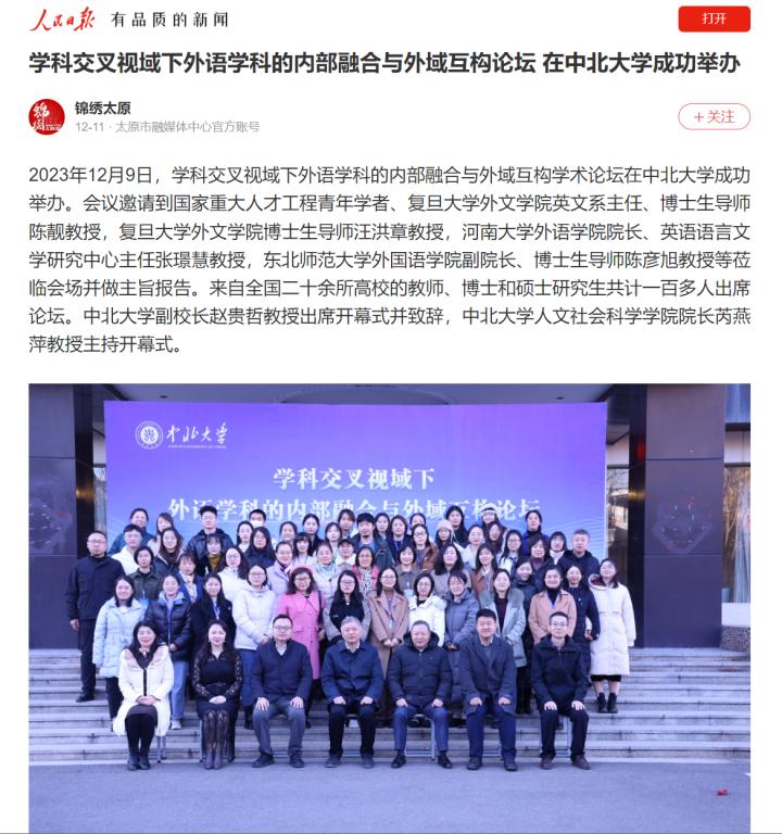 2023年12月9日,学科交叉视域下外语学科的内部融合与外域互构学术论坛在中北大学成功举办。会议邀请到国家重大人才工程青年学者、复旦大学外文学院英文系主任、博士生导师陈靓教授,复旦大学外文学院博士生导师汪洪章教授,河南大学外语学院院长、英语语言文学研究中心主任张璟慧教授,东北师范大学外国语学院副院长、博士生导师陈彦旭教授等莅临会场并做主旨报告。来自全国二十余所高校的教师、博士和硕士研究生共计一百多人出席论坛。中北大学副校长赵贵哲教授出席开幕式并致辞,中北大学人文社会科学学院院长芮燕萍教授主持开幕式。