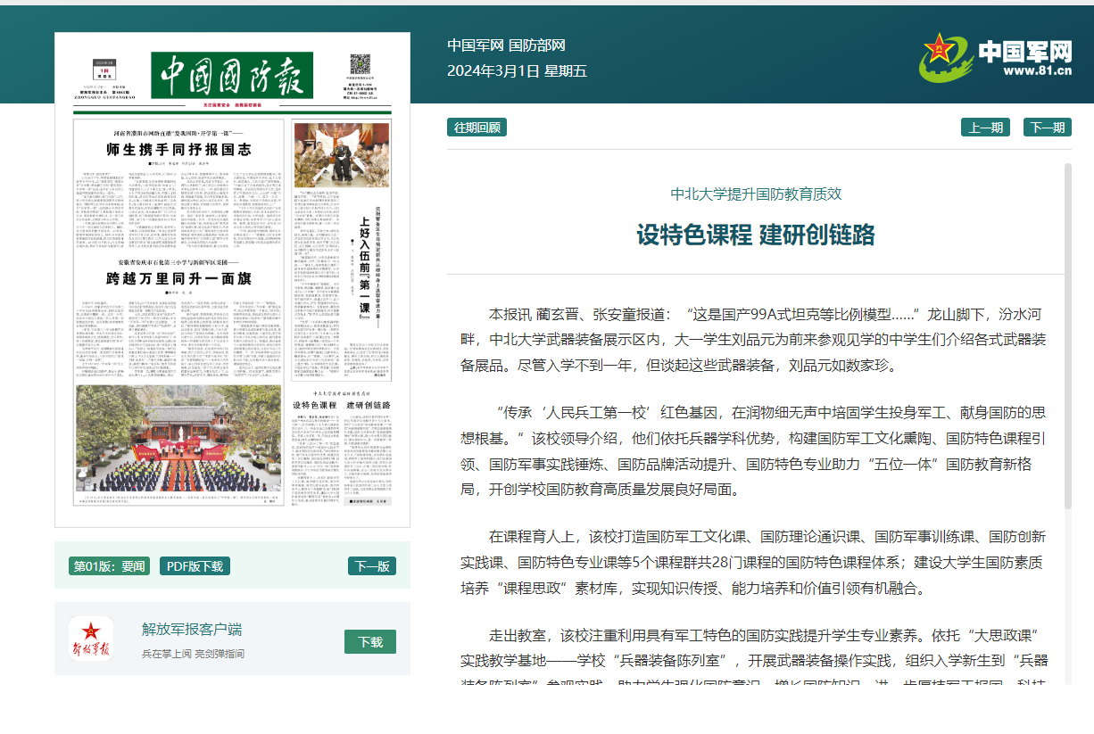 “传承‘人民兵工第一校’红色基因,在润物细无声中培固学生投身军工、献身国防的思想根基。”该校领导介绍,他们依托兵器学科优势,构建国防军工文化熏陶、国防特色课程引领、国防军事实践锤炼、国防品牌活动提升、国防特色专业助力“五位一体”国防教育新格局,开创学校国防教育高质量发展良好局面。
