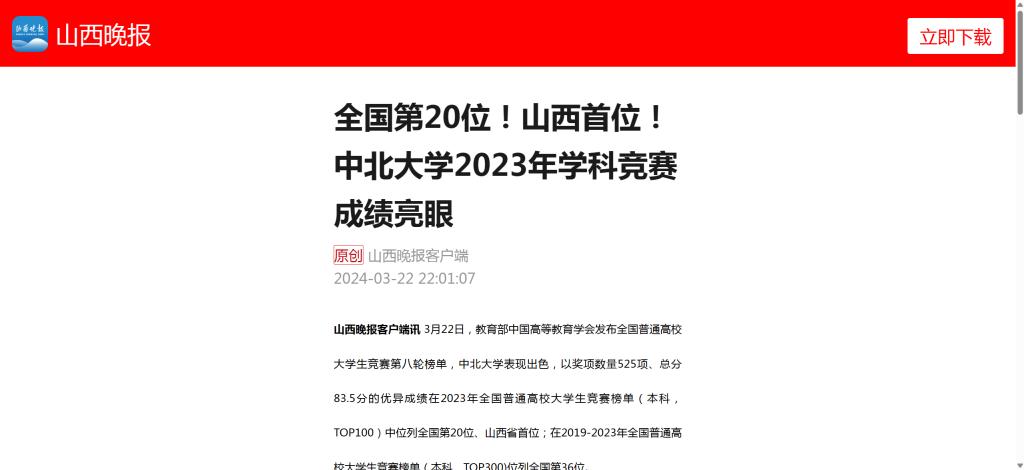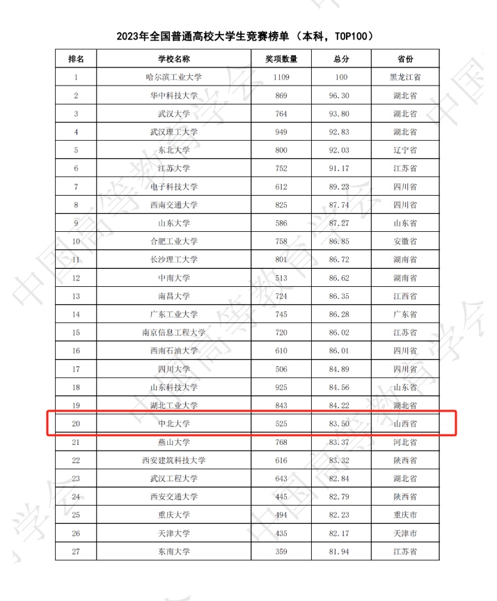 3月22日,教育部中国高等教育学会发布全国普通高校大学生竞赛第八轮榜单,中北大学表现出色,以奖项数量525项、总分83.5分的优异成绩在2023年全国普通高校大学生竞赛榜单(本科,TOP100)中位列全国第20位、山西省首位;在2019-2023年全国普通高校大学生竞赛榜单(本科,TOP300)位列全国第36位。