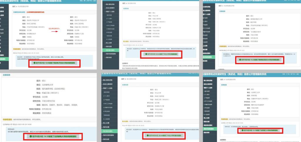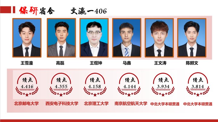 最终宿舍2名成员王文涛、陈颢文上岸中北大学本校本硕贯通计划,4名成员高磊、王雪潼、王煜坤、马鑫分别保送至西安电子科技大学、北京邮电大学、北京理工大学、南京航空航天大学。