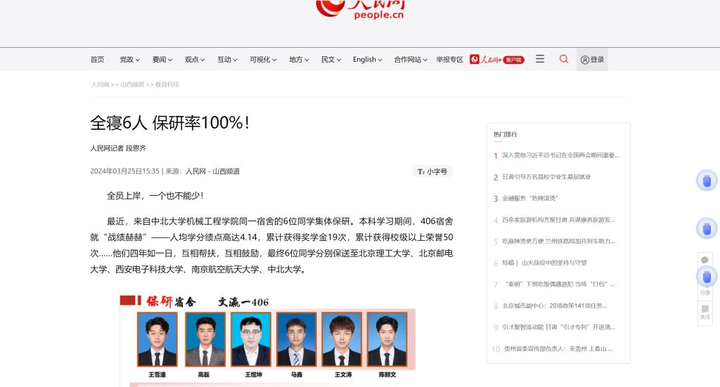 最近,来自中北大学机械工程学院同一宿舍的6位同学集体保研。本科学习期间,406宿舍就“战绩赫赫”——人均学分绩点高达4.14,累计获得奖学金19次,累计获得校级以上荣誉50次……他们四年如一日,互相帮扶,互相鼓励,最终6位同学分别保送至北京理工大学、北京邮电大学、西安电子科技大学、南京航空航天大学、中北大学。