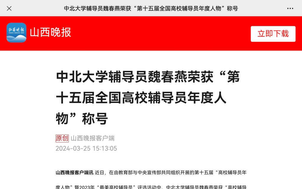 近日,在由教育部与中央宣传部共同组织开展的第十五届“高校辅导员年度人物”暨2023年“最美高校辅导员”评选活动中,中北大学辅导员魏春燕荣获“高校辅导员年度人物”(全国20人),这是该校辅导员首次获此殊荣,标志着中北大学辅导员队伍建设水平取得新突破。