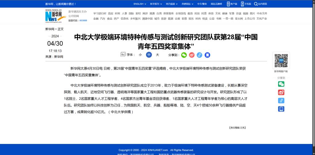 新华网太原4月30日电 日前,第28届“中国青年五四奖章”评选揭晓,中北大学极端环境特种传感与测试创新研究团队荣获“中国青年五四奖章集体”。