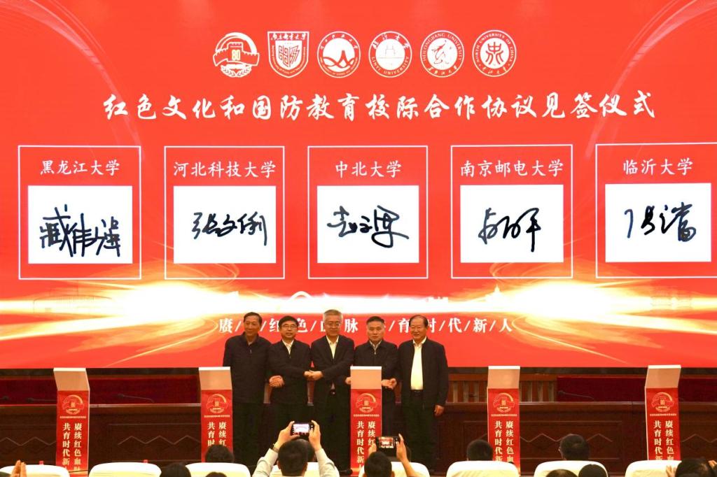 研讨会上,中北大学、南京邮电大学、河北科技大学、临沂大学、黑龙江大学五校共同签署了红色文化和国防教育校际合作协议。