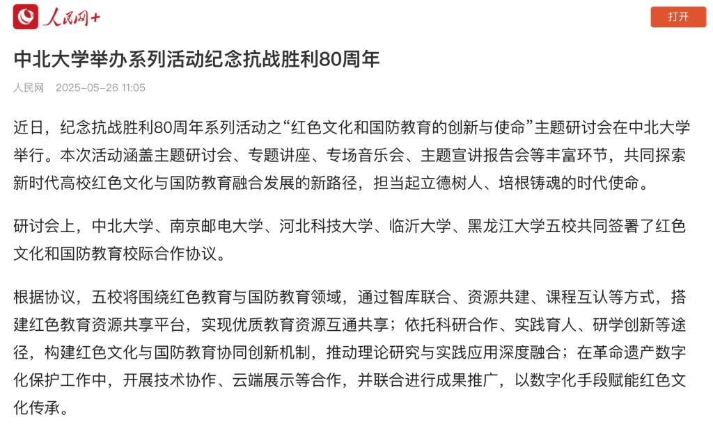 根据协议,五校将围绕红色教育与国防教育领域,通过智库联合、资源共建、课程互认等方式,搭建红色教育资源共享平台,实现优质教育资源互通共享;依托科研合作、实践育人、研学创新等途径,构建红色文化与国防教育协同创新机制,推动理论研究与实践应用深度融合;在革命遗产数字化保护工作中,开展技术协作、云端展示等合作,并联合进行成果推广,以数字化手段赋能红色文化传承。