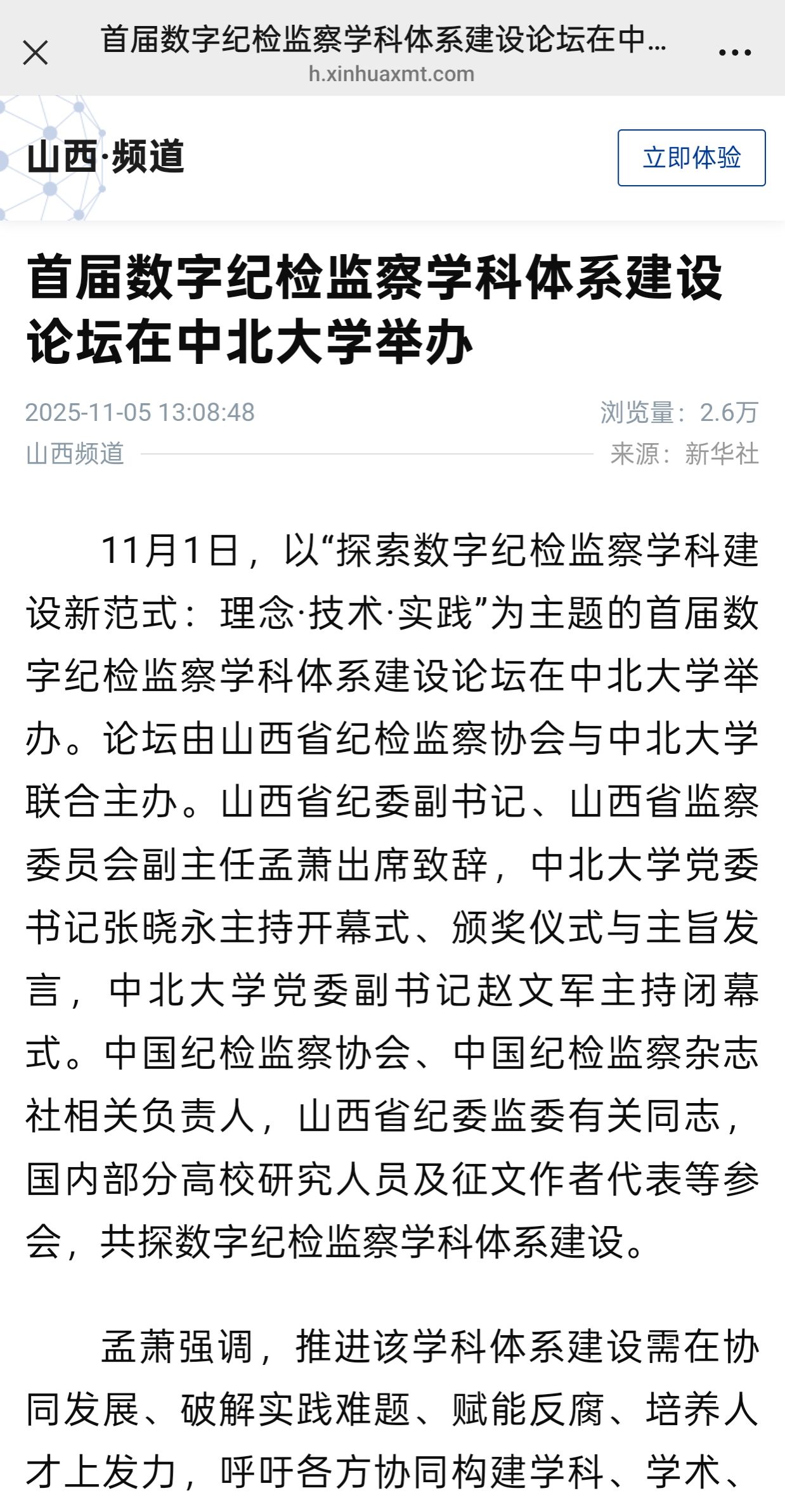 11月1日,以“探索数字纪检监察学科建设新范式:理念·技术·实践”为主题的首届数字纪检监察学科体系建设论坛在中北大学举办。论坛由山西省纪检监察协会与中北大学联合主办。山西省纪委副书记、山西省监察委员会副主任孟萧出席致辞,中北大学党委书记张晓永主持开幕式、颁奖仪式与主旨发言,中北大学党委副书记赵文军主持闭幕式。中国纪检监察协会、中国纪检监察杂志社相关负责人,山西省纪委监委有关同志,国内部分高校研究人员及征文作者代表等参会,共探数字纪检监察学科体系建设。