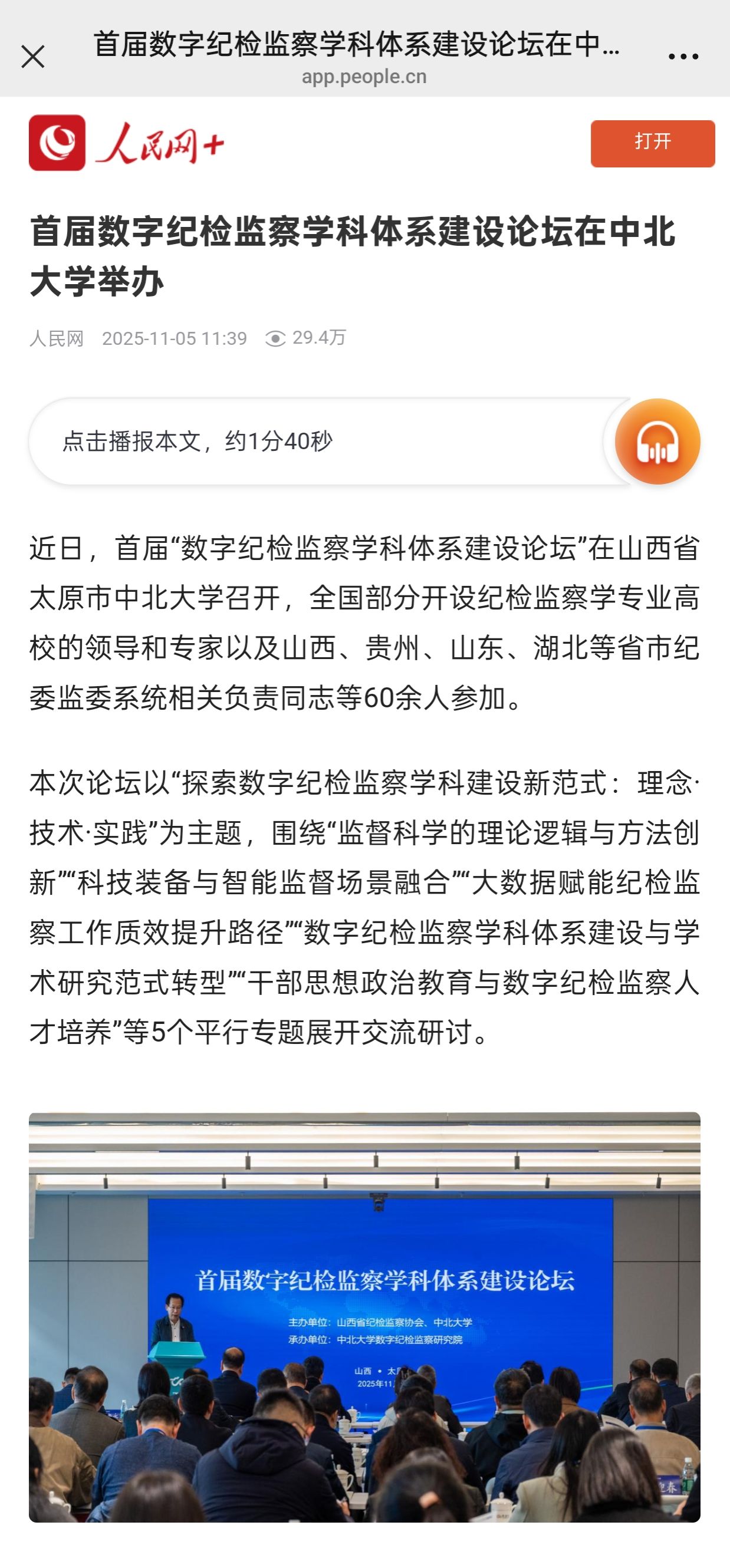 本次论坛以“探索数字纪检监察学科建设新范式:理念·技术·实践”为主题,围绕“监督科学的理论逻辑与方法创新”“科技装备与智能监督场景融合”“大数据赋能纪检监察工作质效提升路径”“数字纪检监察学科体系建设与学术研究范式转型”“干部思想政治教育与数字纪检监察人才培养”等5个平行专题展开交流研讨。