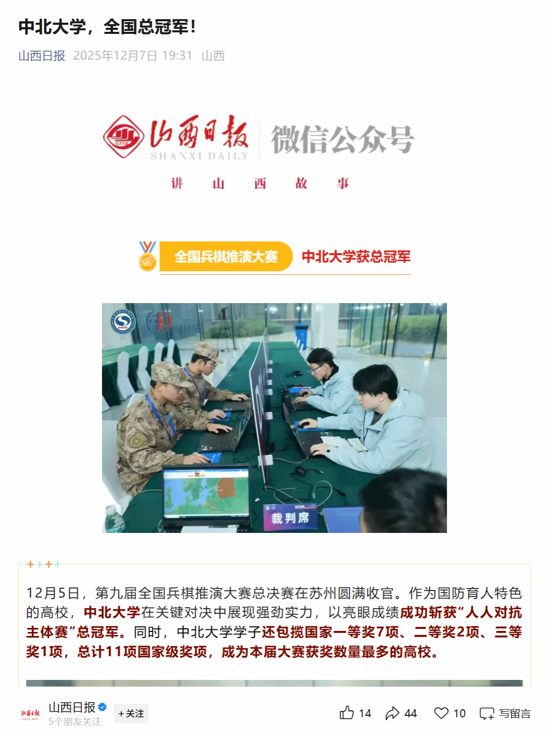 12月5日,第九届全国兵棋推演大赛总决赛在苏州圆满收官。作为国防育人特色的高校,中北大学在关键对决中展现强劲实力,以亮眼成绩成功斩获“人人对抗主体赛”总冠军。同时,中北大学学子还包揽国家一等奖7项、二等奖2项、三等奖1项,总计11项国家级奖项,成为本届大赛获奖数量最多的高校。