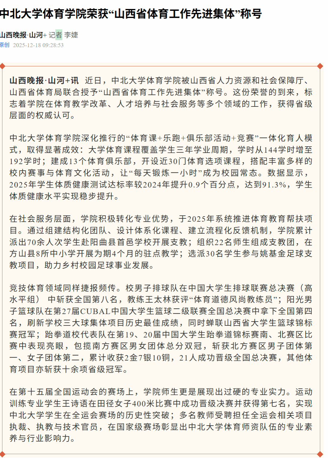 山西晚报·山河+讯 近日,中北大学体育学院被山西省人力资源和社会保障厅、山西省体育局联合授予“山西省体育工作先进集体”称号。这份荣誉的到来,标志着学院在体育教学改革、人才培养与社会服务等多个领域的工作,获得省级层面的权威认可。