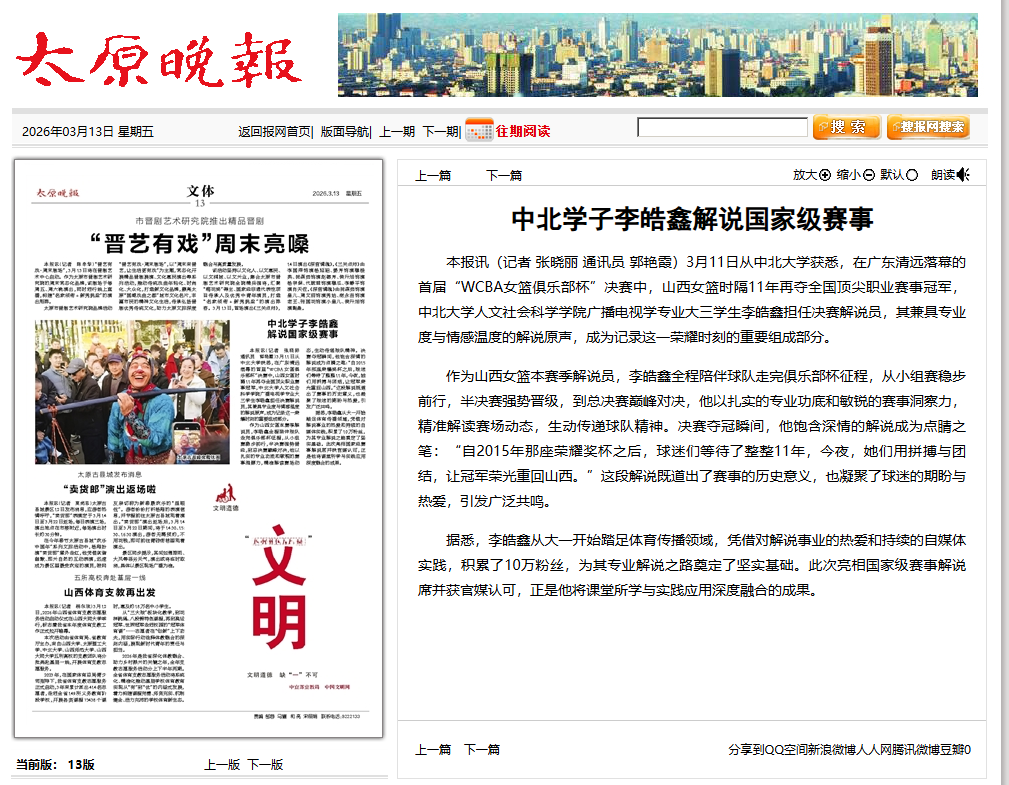 本报讯(记者 张晓丽 通讯员 郭艳霞)3月11日从中北大学获悉,在广东清远落幕的首届“WCBA女篮俱乐部杯”决赛中,山西女篮时隔11年再夺全国顶尖职业赛事冠军,中北大学人文社会科学学院广播电视学专业大三学生李皓鑫担任决赛解说员,其兼具专业度与情感温度的解说原声,成为记录这一荣耀时刻的重要组成部分。