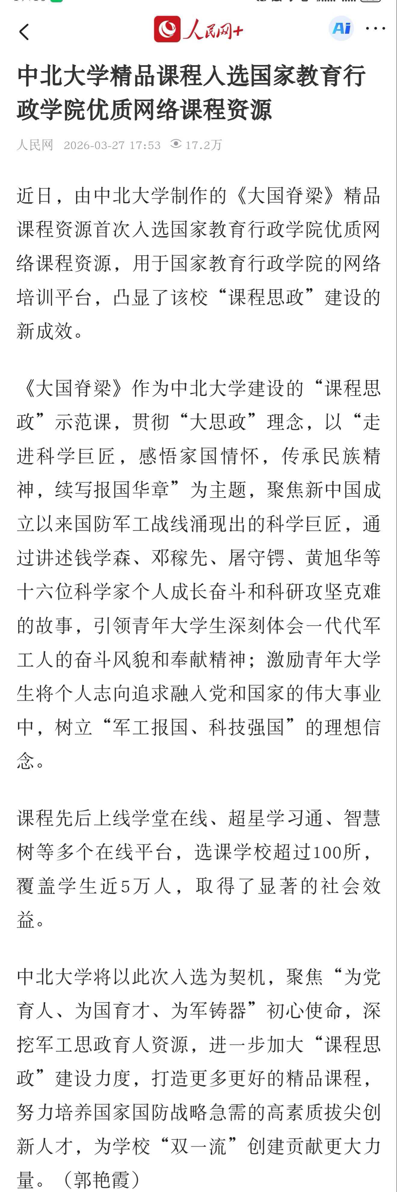 近日,由中北大学制作的《大国脊梁》精品课程资源首次入选国家教育行政学院优质网络课程资源,用于国家教育行政学院的网络培训平台,凸显了该校“课程思政”建设的新成效。