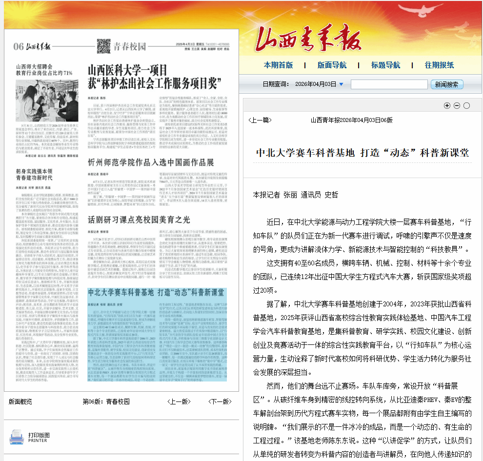 据了解,中北大学赛车科普基地创建于2004年,2023年获批山西省科普基地,2025年获评山西省高校综合性教育实践体验基地、中国汽车工程学会汽车科普教育基地,是集科普教育、研学实践、校园文化建设、创新创业及竞赛活动于一体的综合性实践教育平台,以“行知车队”为核心运营力量,生动诠释了新时代高校如何将科研优势、学生活力转化为服务社会发展的深层担当。