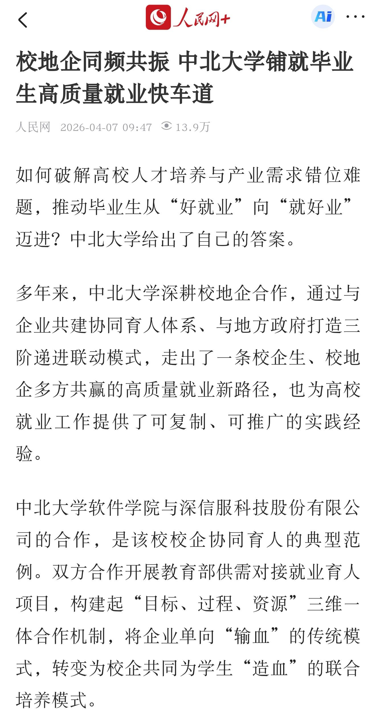 多年来,中北大学深耕校地企合作,通过与企业共建协同育人体系、与地方政府打造三阶递进联动模式,走出了一条校企生、校地企多方共赢的高质量就业新路径,也为高校就业工作提供了可复制、可推广的实践经验。