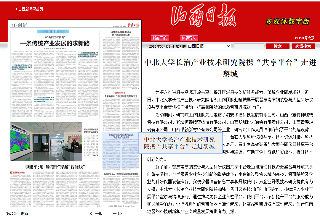 据了解,晋东南高端装备与大型科研仪器共享平台是当地推动科技资源整合与开放共享的重要举措,也是服务企业科技创新的重要载体。平台通过整合区域内高校、科研院所及企业的科研仪器设备资源,实现仪器设备信息共享和开放使用,为企业开展技术研发提供有力支撑。中北大学长治产业技术研究院将加强与各县区科技部门的协同合作,持续深入企业开展平台宣讲与精准服务,通过推动更多企业入驻平台、使用平台,不断提升平台的服务能力和区域影响力,让“沉睡”的科研仪器“活”起来,让高端科研资源“流”起来,为晋东南地区的科技创新和产业高质量发展提供有力支撑。(本报记者沈佳)