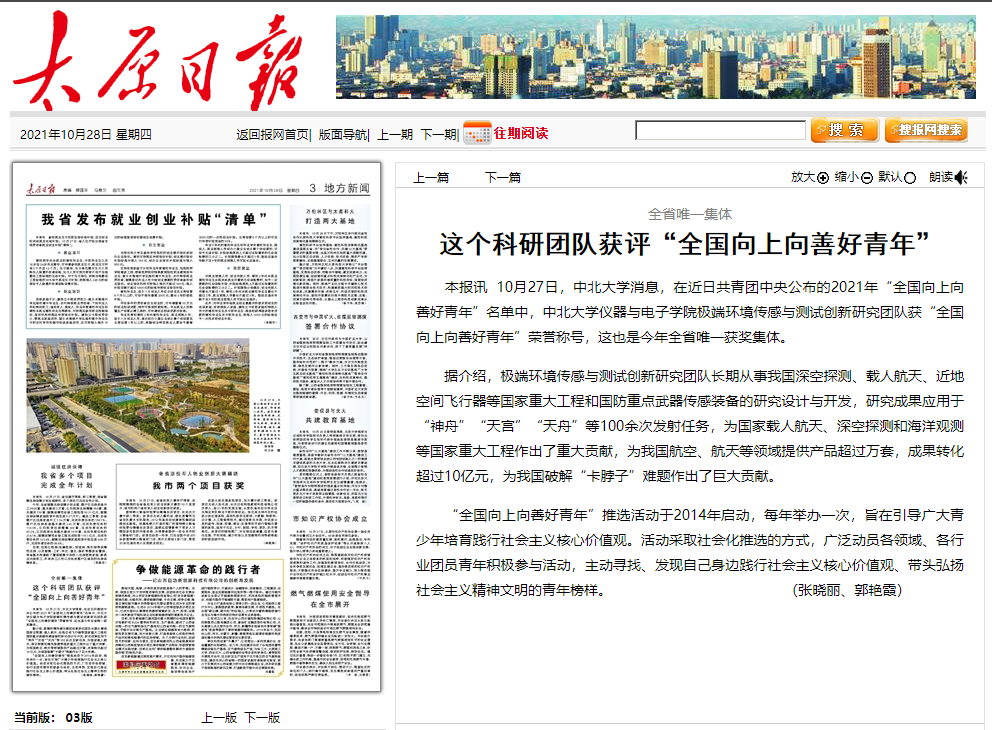 10月27日,中北大学消息,在近日共青团中央公布的2021年“全国向上向善好青年”名单中,中北大学仪器与电子学院极端环境传感与测试创新研究团队获“全国向上向善好青年”荣誉称号,这也是今年全省唯一获奖集体。