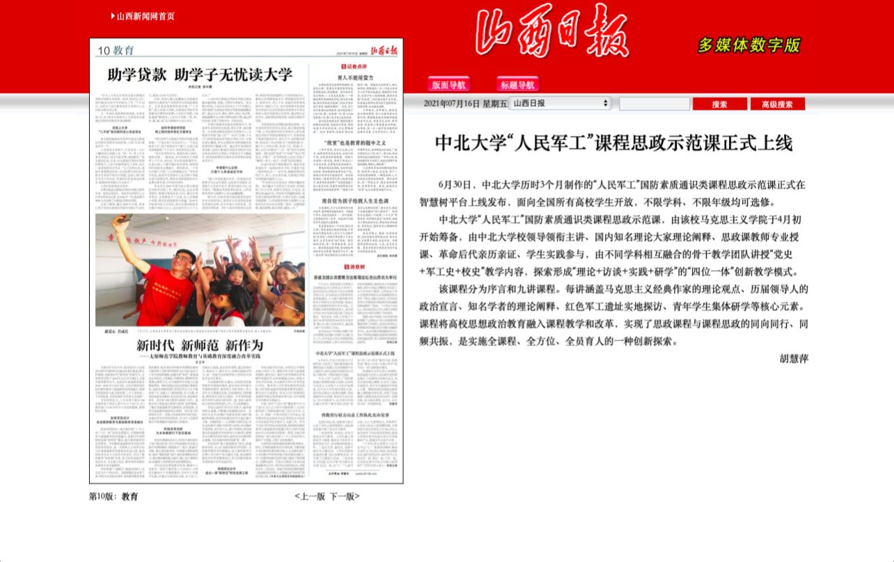 中北大学“人民军工”国防素质通识类课程思政示范课,由该校马克思主义学院于4月初开始筹备,由中北大学校领导领衔主讲、国内知名理论大家理论阐释、思政课教师专业授课、革命后代亲历亲证、学生实践参与,由不同学科相互融合的骨干教学团队讲授“党史+军工史+校史”教学内容,探索形成“理论+访谈+实践+研学”的“四位一体”创新教学模式。
