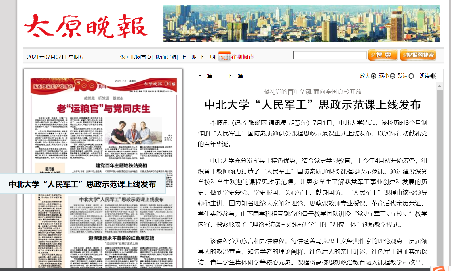 6月30日,中北大学制作的“人民军工”国防素质通识类课程思政示范课正式上线发布,以实际行动庆祝中国共产党成立100周年。