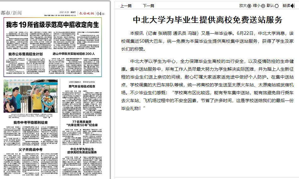 中北大学以学生为中心,全力保障毕业生离校的出行安全,以及疫情防控的生命健康。集中送站服务中,所有工作人员尽最大努力为学生解决实际困难,并为踏上人生新征程的毕业生们送上亲切的问候,耐心叮嘱大家返家返岗途中做好个人防护。在集中送站点,学校调集的大巴车排队等候,统一将离校的学生送至太原火车站、太原南站或武宿机场。不少毕业生们感慨:“学校离市区比较远,能有专车集中送站,能有效避免自行乘车去火车站、飞机场过程中的不安全因素,节省了许多时间,这是学校送给我们的最后一份毕业礼物!”(本报记者 张晓丽 冯璇)