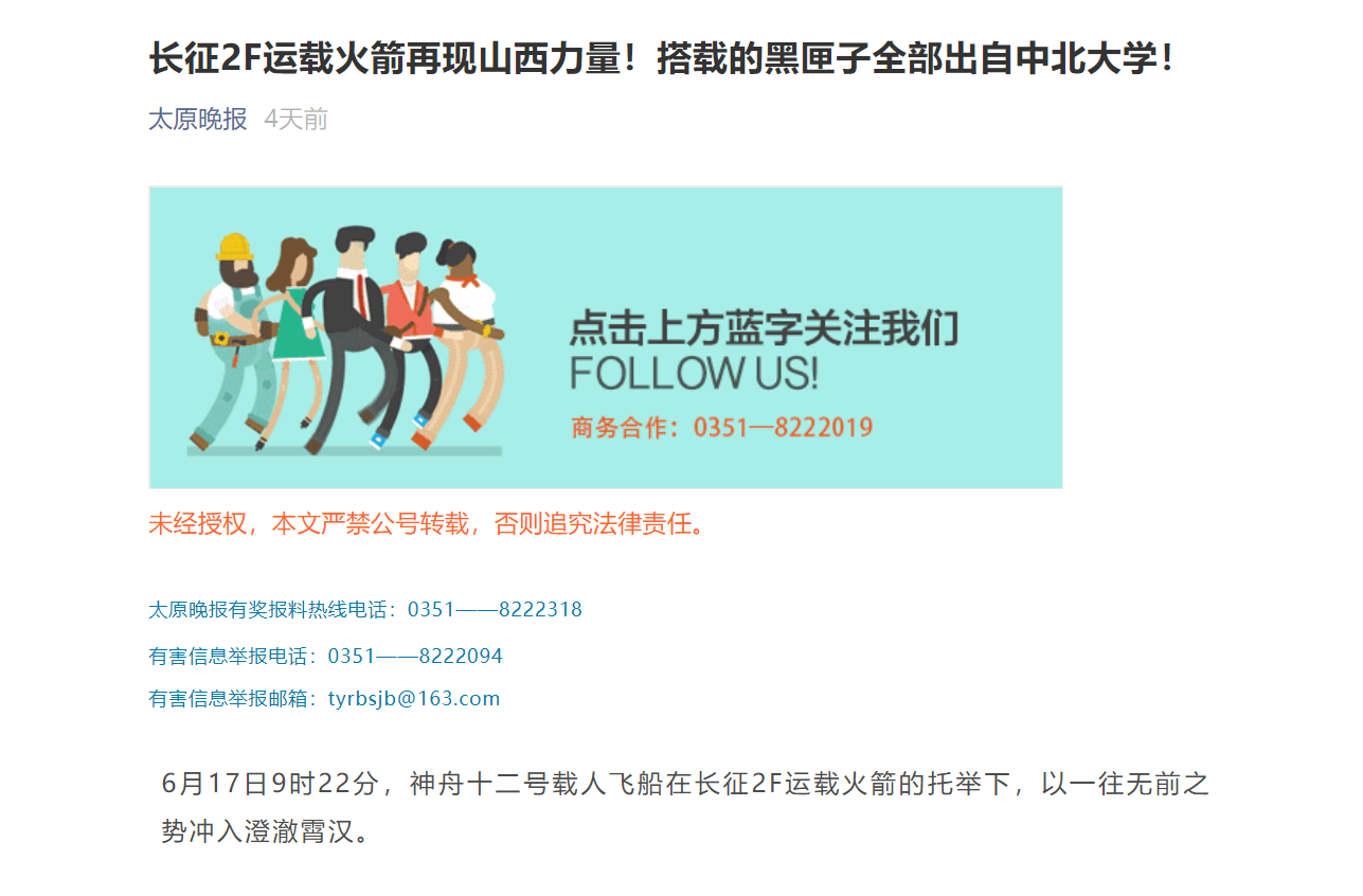 据了解,中北大学研制的“黑匣子”已承担了从神舟一号到神舟十二号,天宫一号到天宫二号的多次飞行实验任务,为中国航天事业的发展贡献了山西力量。(太原晚报记者 张晓丽)