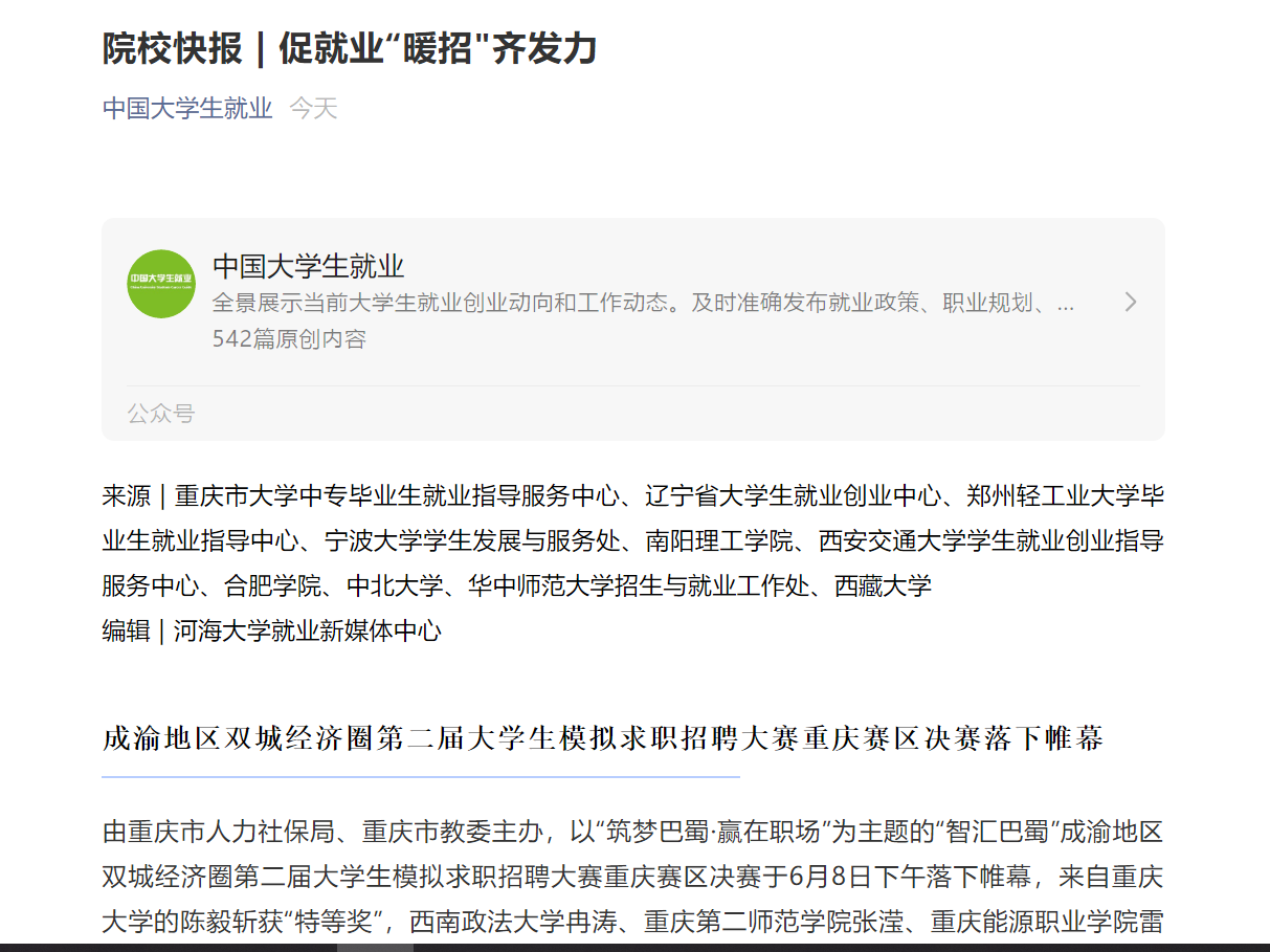 (来源 | 重庆市大学中专毕业生就业指导服务中心、辽宁省大学生就业创业中心、郑州轻工业大学毕业生就业指导中心、宁波大学学生发展与服务处、南阳理工学院、西安交通大学学生就业创业指导服务中心、合肥学院、中北大学、华中师范大学招生与就业工作处、西藏大学