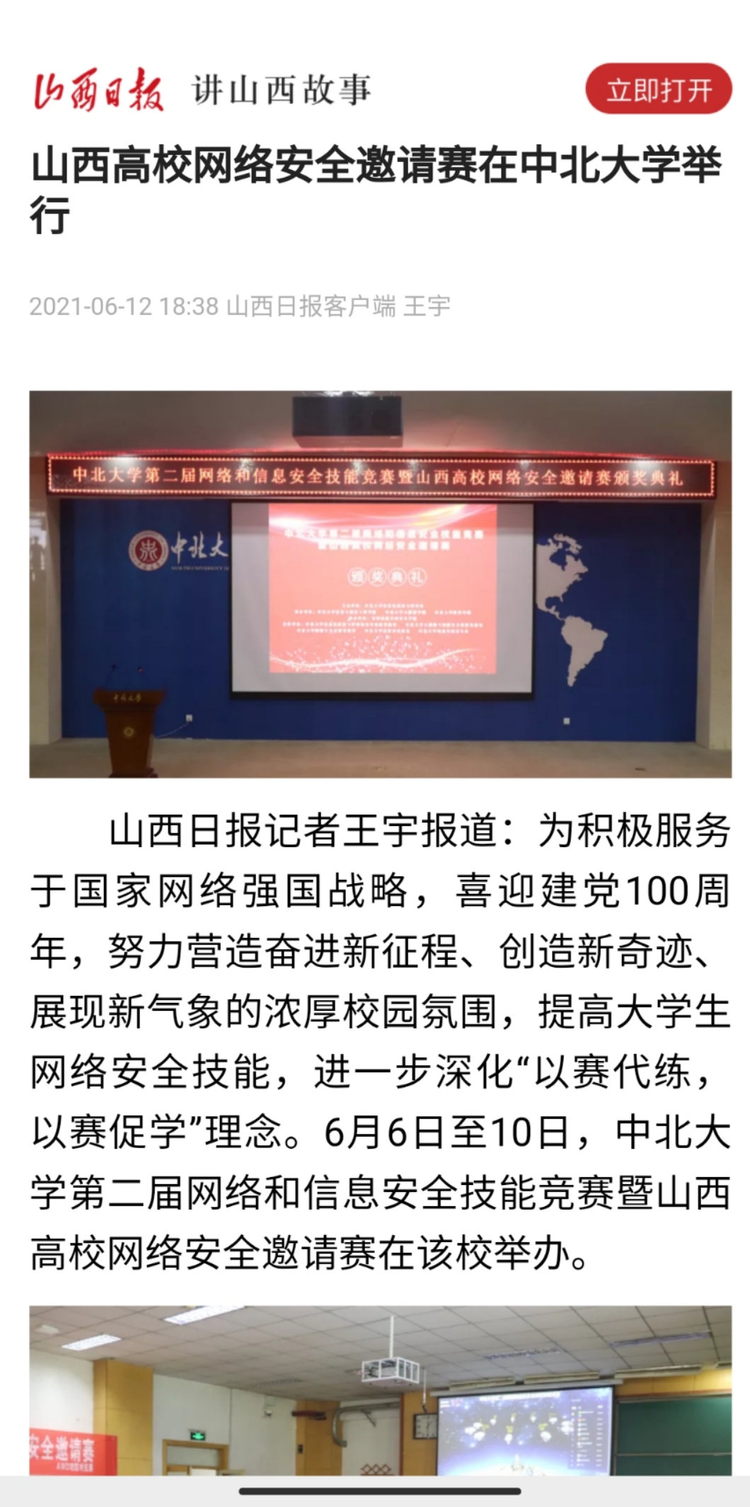 山西日报记者王宇报道:为积极服务于国家网络强国战略,喜迎建党100周年,努力营造奋进新征程、创造新奇迹、展现新气象的浓厚校园氛围,提高大学生网络安全技能,进一步深化“以赛代练,以赛促学”理念。6月6日至10日,中北大学第二届网络和信息安全技能竞赛暨山西高校网络安全邀请赛在该校举办。