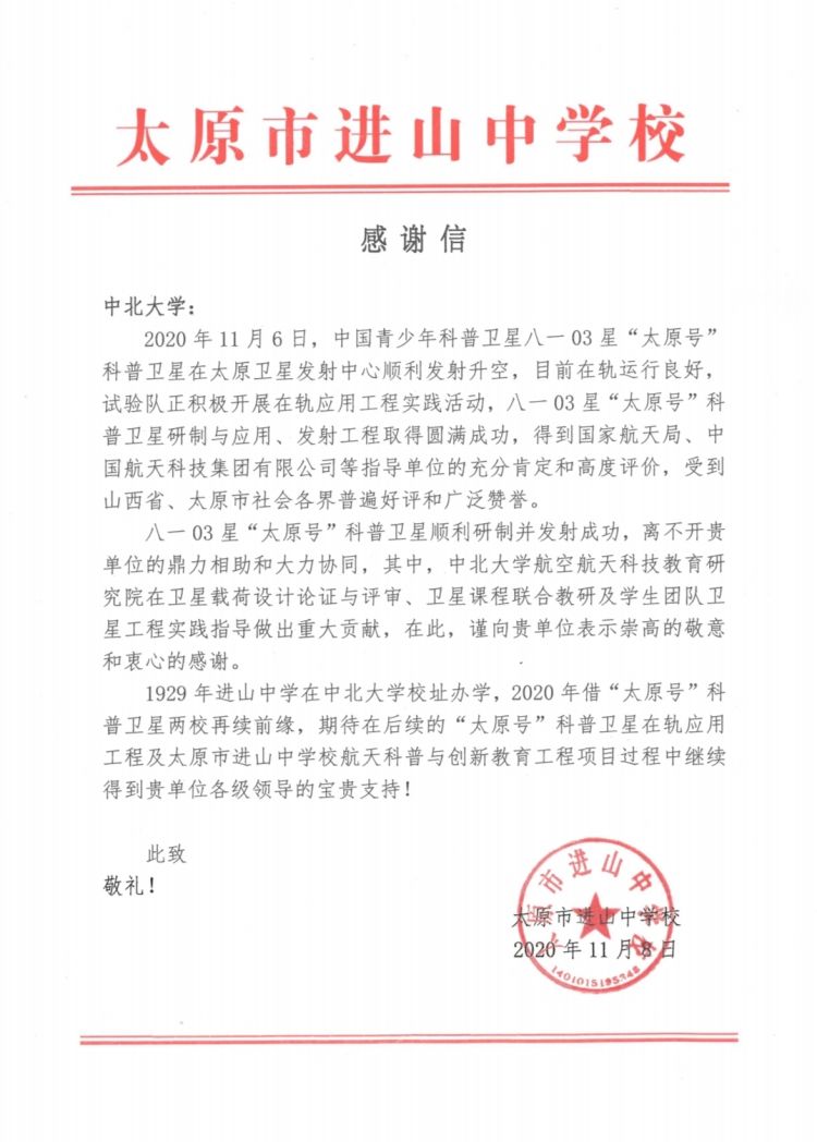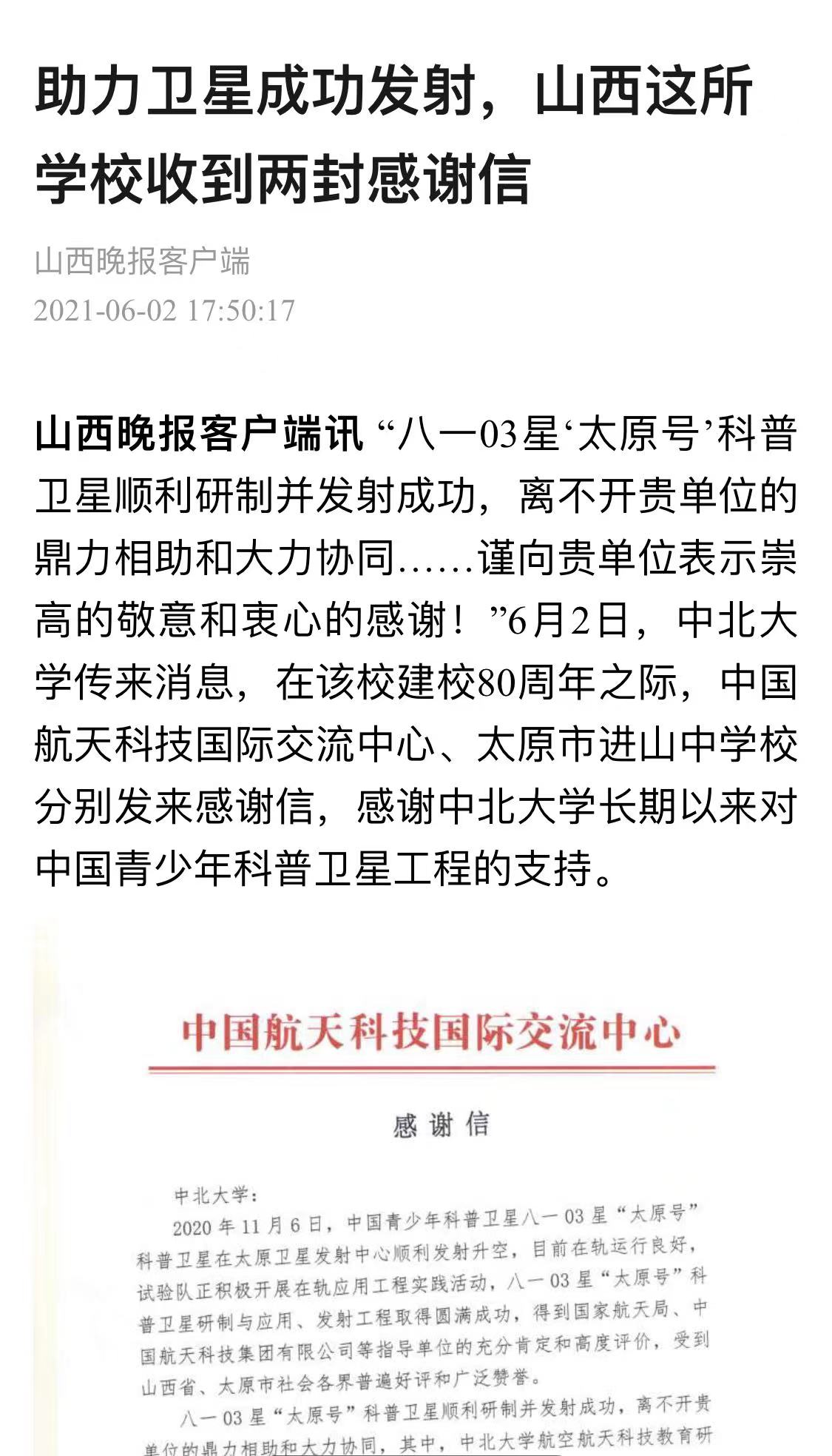 “八一03星‘太原号’科普卫星顺利研制并发射成功,离不开贵单位的鼎力相助和大力协同……谨向贵单位表示崇高的敬意和衷心的感谢!”6月2日,中北大学传来消息,在该校建校80周年之际,中国航天科技国际交流中心、太原市进山中学校分别发来感谢信,感谢中北大学长期以来对中国青少年科普卫星工程的支持。