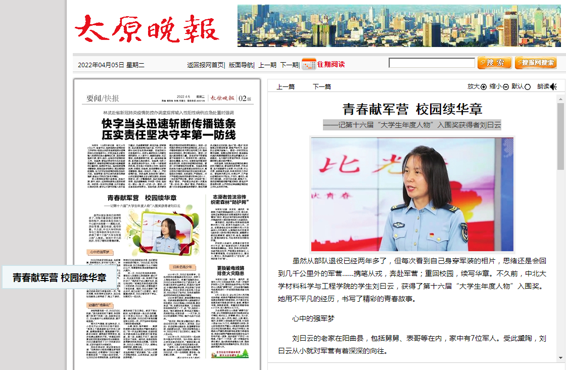 虽然从部队退役已经两年多了,但每次看到自己身穿军装的相片,思绪还是会回到几千公里外的军营……携笔从戎,奔赴军营;重回校园,续写华章。不久前,中北大学材料科学与工程学院的学生刘曰云,获得了第十六届“大学生年度人物”入围奖。她用不平凡的经历,书写了精彩的青春故事。