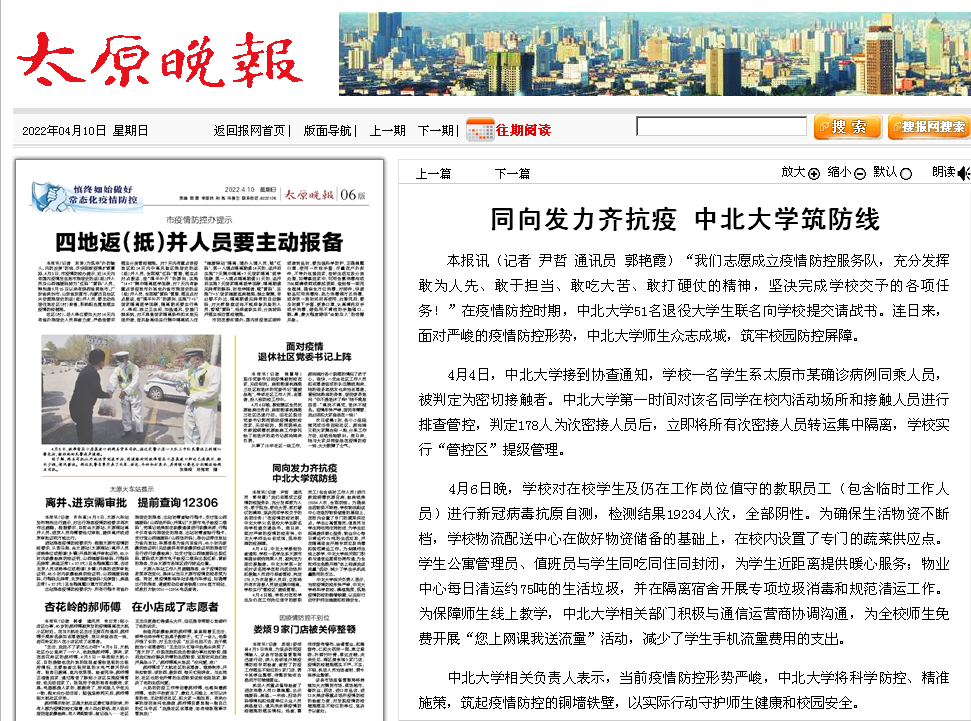 中北大学相关负责人表示,当前疫情防控形势严峻,中北大学将科学防控、精准施策,筑起疫情防控的铜墙铁壁,以实际行动守护师生健康和校园安全。(记者 尹哲 通讯员 郭艳霞)