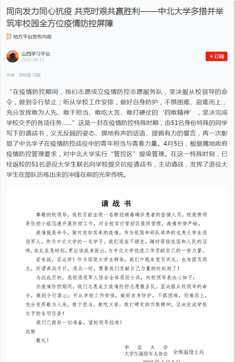 在疫情防控期间,我们志愿成立疫情防控志愿服务队,坚决服从校领导的命令,做到令行禁止;听从学校工作安排,做好自身防护,不惧困难、迎难而上,充分发挥敢为人先、敢于担当、敢吃大苦、敢打硬仗的‘四敢精神’,坚决完成学校交予的各项任务……”这是一封在疫情防控特殊时期,由51名身份特殊的同学写下的请战书,义无反顾的姿态、掷地有声的话语、铿锵有力的誓言,再一次彰显了中北学子在疫情防控战役中的青年担当与青春力量。4月5日,根据属地政府疫情防控管理要求,对中北大学实行“管控区”提级管理。在这一特殊时刻,已经返校的51名退役大学生联名向学校提交抗疫请战书,主动请战,发挥了退役大学生在部队历练出来的冲锋在前的光荣传统。