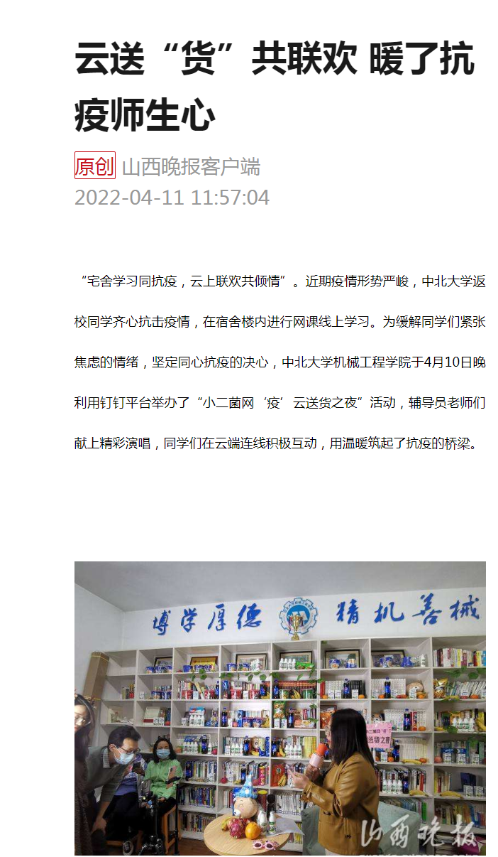 “宅舍学习同抗疫,云上联欢共倾情”。近期疫情形势严峻,中北大学返校同学齐心抗击疫情,在宿舍楼内进行网课线上学习。为缓解同学们紧张焦虑的情绪,坚定同心抗疫的决心,中北大学机械工程学院于4月10日晚利用钉钉平台举办了“小二菌网‘疫’云送货之夜”活动,辅导员老师们献上精彩演唱,同学们在云端连线积极互动,用温暖筑起了抗疫的桥梁。