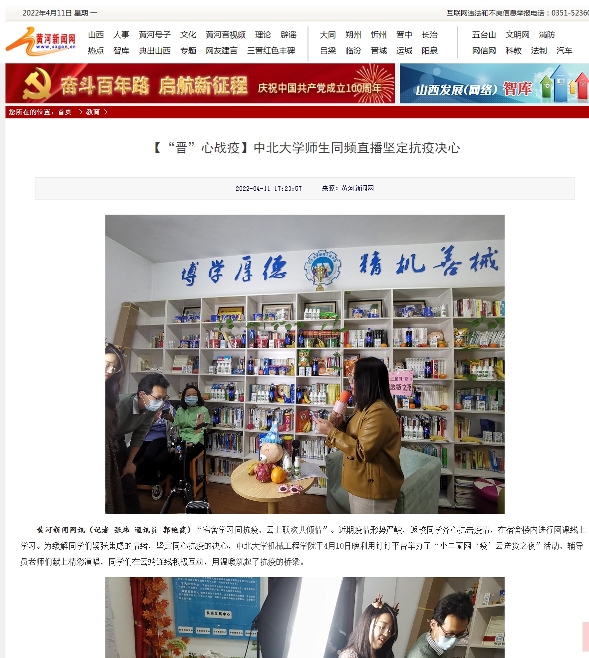 “宅舍学习同抗疫,云上联欢共倾情”。近期疫情形势严峻,返校同学齐心抗击疫情,在宿舍楼内进行网课线上学习。为缓解同学们紧张焦虑的情绪,坚定同心抗疫的决心,中北大学机械工程学院于4月10日晚利用钉钉平台举办了“小二菌网‘疫’云送货之夜”活动,辅导员老师们献上精彩演唱,同学们在云端连线积极互动,用温暖筑起了抗疫的桥梁。
