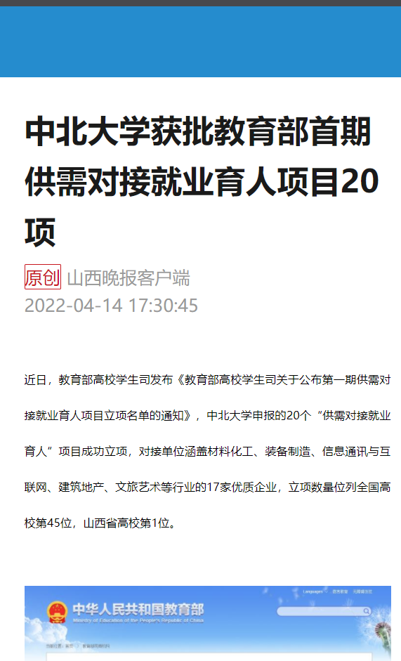近日,教育部高校学生司发布《教育部高校学生司关于公布第一期供需对接就业育人项目立项名单的通知》,中北大学申报的20个“供需对接就业育人”项目成功立项,对接单位涵盖材料化工、装备制造、信息通讯与互联网、建筑地产、文旅艺术等行业的17家优质企业,立项数量位列全国高校第45位,山西省高校第1位。
