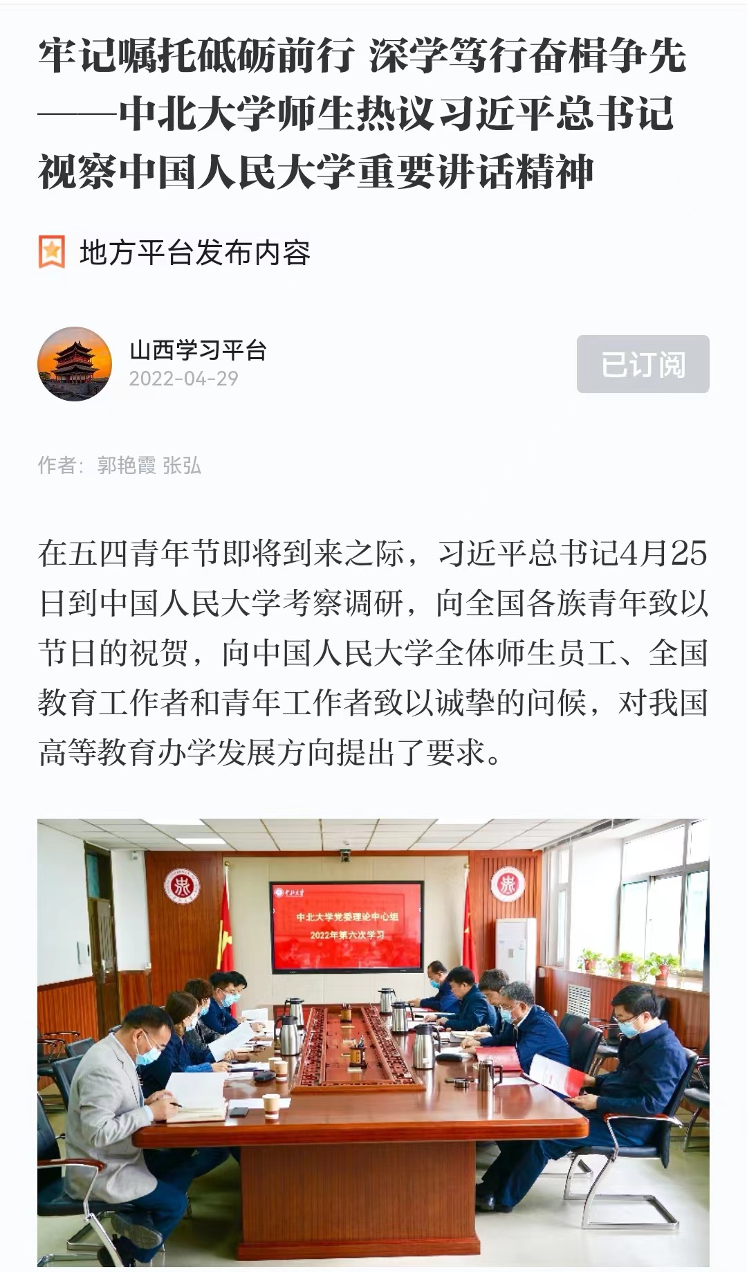 4月26日、28日,中北大学分别组织召开学生、青年教师、思政课教师和辅导员座谈会,校党委理论学习中心组召开专题学习会,第一时间传达习近平总书记考察中国人民大学重要讲话精神,并进行集中学习。通过学习,广大教师认为,习近平总书记重要讲话为我们做好新时代教育工作指明了方向、提供了遵循、增添了动力;青年学生纷纷表示,要更加坚定理想信念,听党话、跟党走,争做“复兴栋梁、强国先锋”。同时,习近平总书记视察中国人民大学重要讲话在中北大学师生中引发热烈反响,并迅速在全校范围内掀起学习习近平总书记重要讲话精神的热潮。