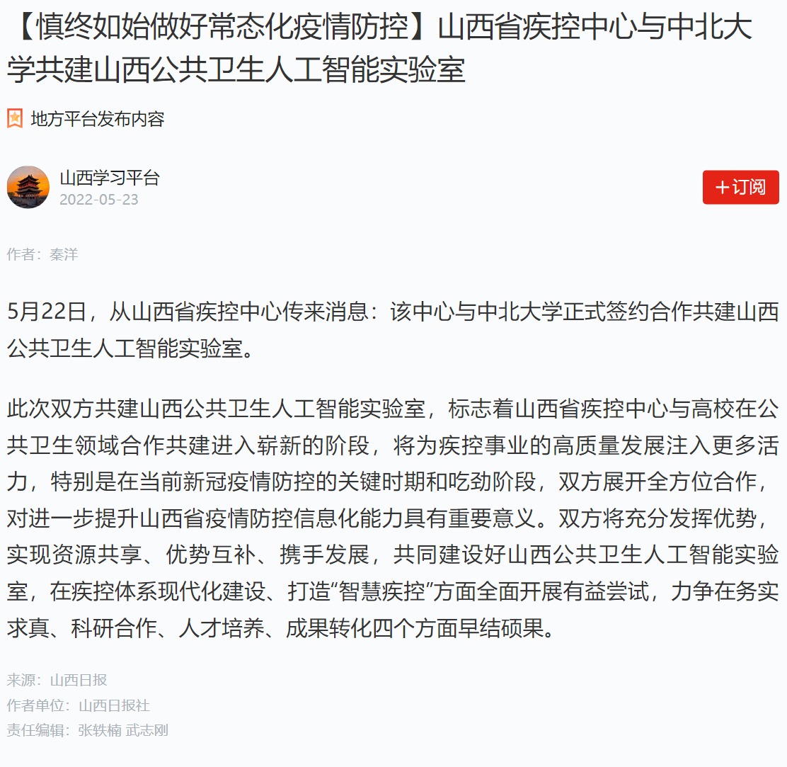 5月22日,从山西省疾控中心传来消息:该中心与中北大学正式签约合作共建山西公共卫生人工智能实验室。