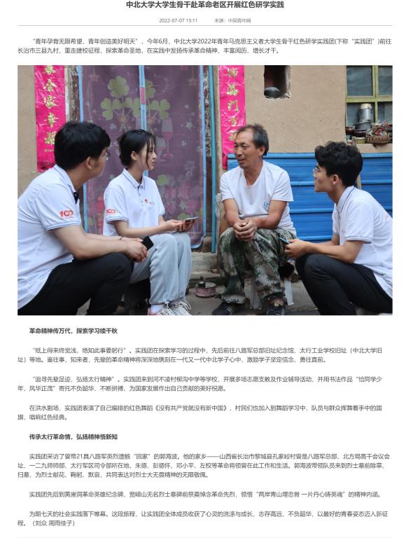 “青年孕育无限希望,青年创造美好明天”,今年6月,中北大学2022年青年马克思主义者大学生骨干红色研学实践团(下称“实践团”)前往长治市三县九村,重走建校征程,探索革命圣地,在实践中发扬传承革命精神、丰富阅历、增长才干。