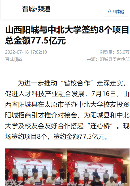 山西阳城与中北大学签约8个项目 总金额77.5亿元