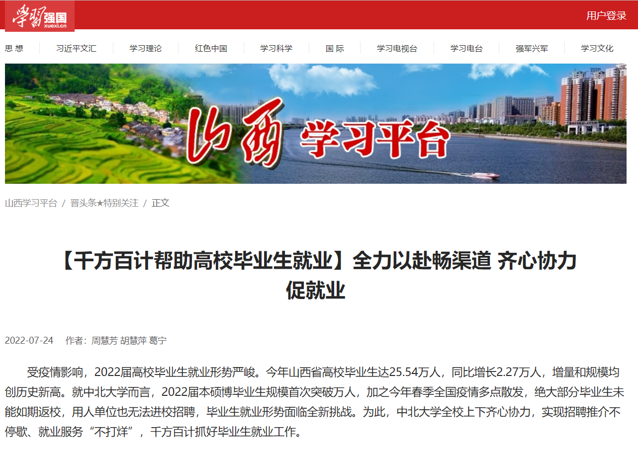 为了毕业生就业这件“头等大事”,中北大学全校上下以高度的政治责任感、使命感和紧迫感,切实做好毕业生就业工作。书记、校长带头,深入落实就业工作“一把手”工程,采取线上线下相结合、分层次分批次稳步推进的措施,深入企业开展调研交流和对接,主动上门推介毕业生,全力以赴推动访企拓岗促就业专项行动取得实效。